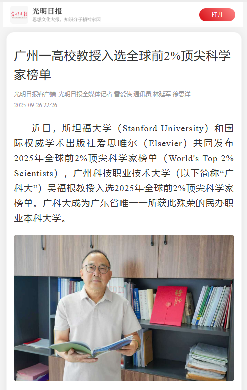 近日,斯坦福大学(Stanford University)和国际权威学术出版社爱思唯尔(Elsevier)共同发布2025年全球前2%顶尖科学家榜单(World's Top 2% Scientists),华亿在线(以下简称“广科大”)吴福根教授入选2025年全球前2%顶尖科学家榜单。广科大成为广东省唯一一所获此殊荣的民办职业本科大学
