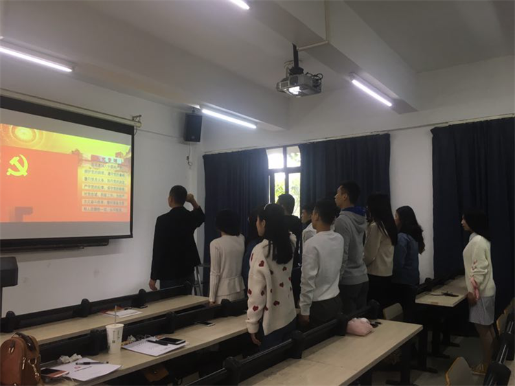 2018年12月14日,外语外贸学院党总支学生党支部召开了关于接收刘嘉芸、洪丽娜、陈海怡、杨淑芬、李训桂5位同学的通表大会,大会通过了接受其5位同志为预备党员的决议,报送学校党委审批。12月25日,学校党委召开了党委会审议一致同意我院党总支学生党支部洪丽娜等5位同志为中共预备党员。27日下午14:30,走进一栋教学楼1206教室,映入眼帘的是一面红灿灿的党旗和令人热血澎湃的入党誓词,今天是我院党总支学生党支部对以上5位同志的入党宣誓的特殊日子。