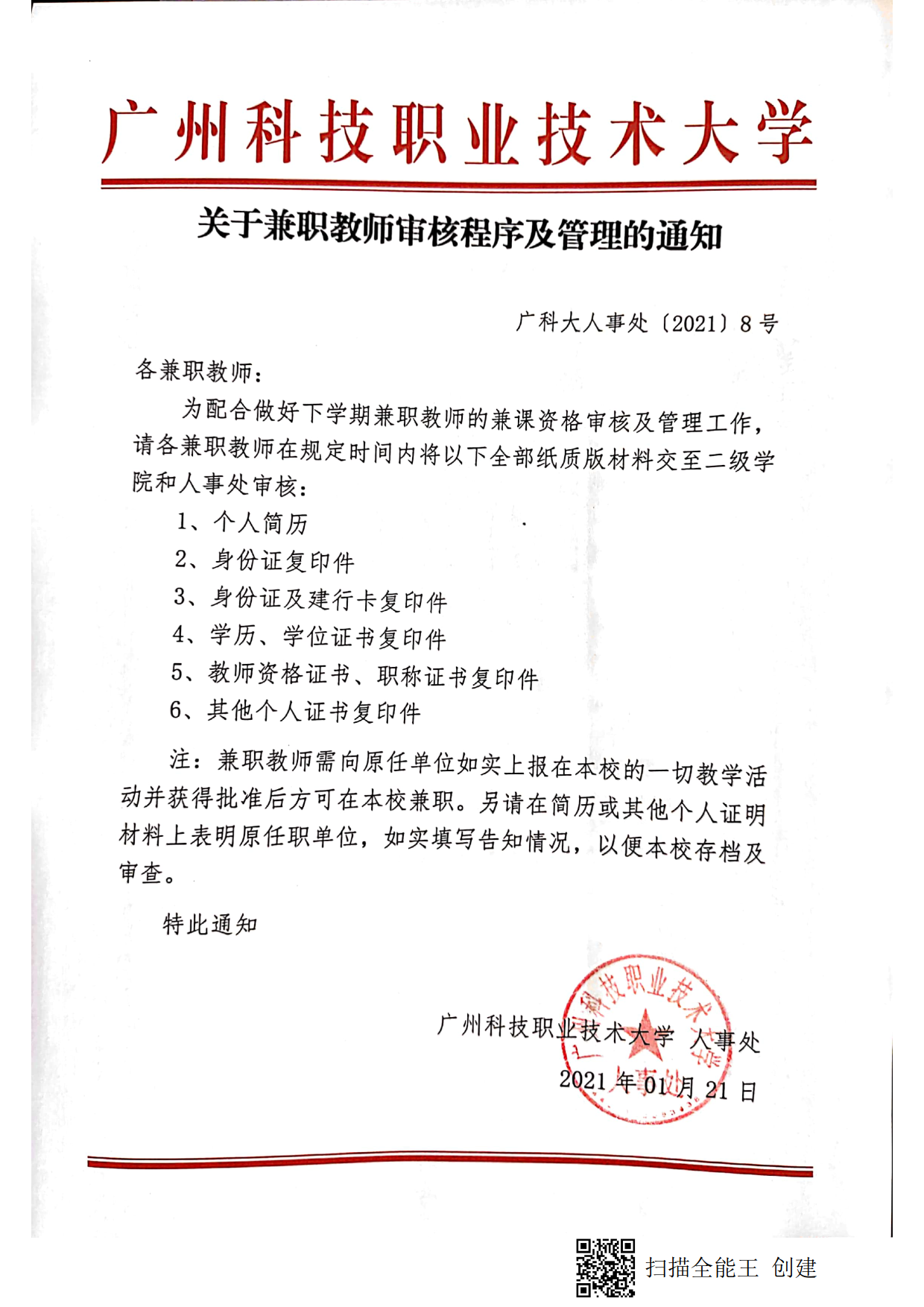 为配合做好下学期兼职教师的讲课资格审核及管理工作,请各兼职教师查阅文件《关于兼职教师审核程序及管理的通知》,按规定提交审核材料。