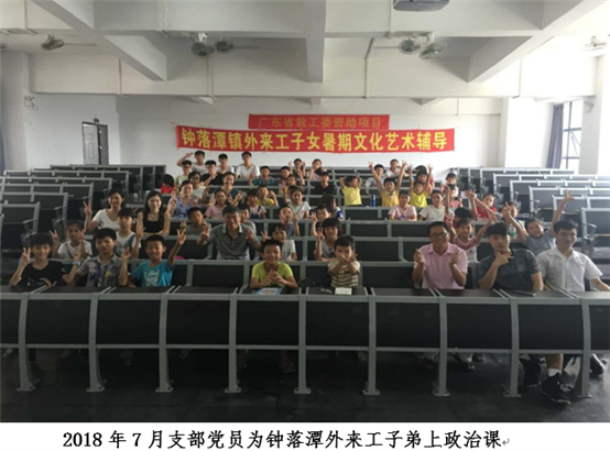 2018年暑期,支部开展关爱活动,给外来工子女提供辅导和教学,在7月份联合汽车工程学院党总支举办了为期十天的服务外来工子弟暑期社会实践文化艺术辅导活动,7月18日,思政部主任曾学龙教授为参加钟落潭镇文化艺术辅导的外来工子弟开设了一堂题为《中国进入新时代》的思政课讲座,汽车工程学院党总支书记曾庆荣、思政部党支部书记王润萍、周娇、邹俊滔、董英华、李丽萍等老师以及汽车工程学院参加暑期社会实践的学生和50多名外来工子弟共60多人均参加了此次活动。