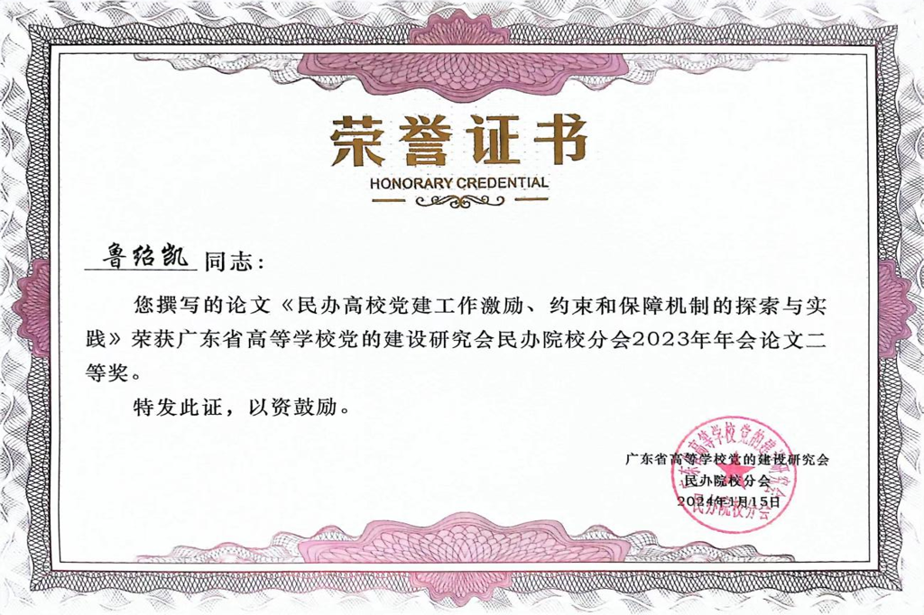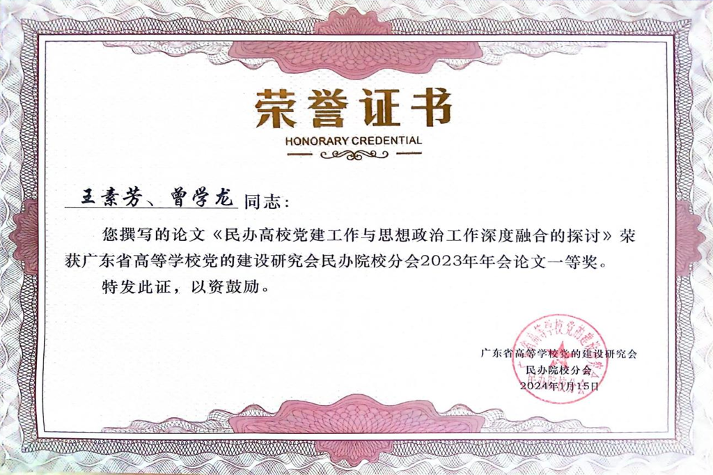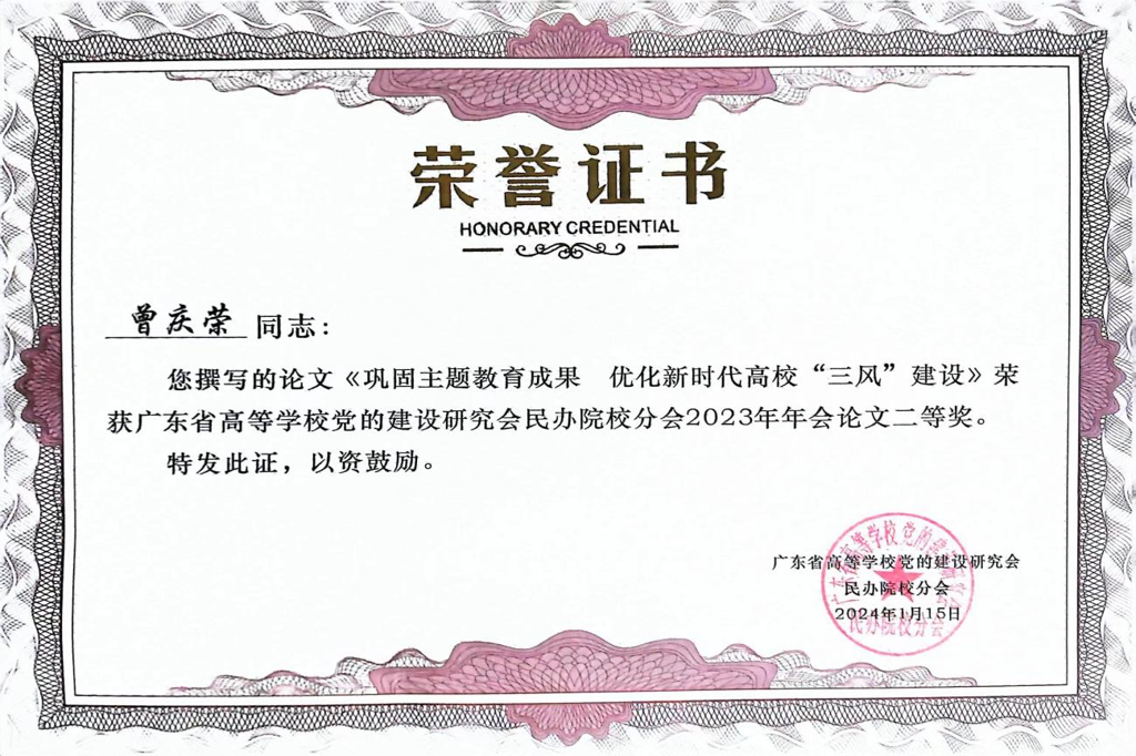 王素芳、曾学龙合撰的论文《民办高校党建工作与思想政治工作深度融合的探讨》获一等奖,曾庆荣的论文《巩固主题教育成果 优化新时代高校“三风”建设》、鲁绍凯的论文《民办高校党建工作激励、约束和保障机制的探索和实践》获二等奖。