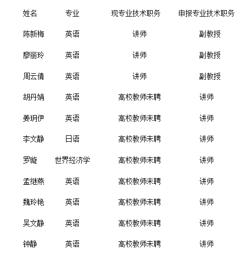 在我校今年专业技术职务自主评审工作中,截止2019年10月16日,共有3位老师申报副教授职务和8位老师申报讲师职务。根据《广州科技职业技术学院教师系列专业技术职务评审条件(试行)》,经外语外贸学院专业技术职务材料审核组的审核,对以下11位老师的材料进行公示(按姓氏笔画为序):