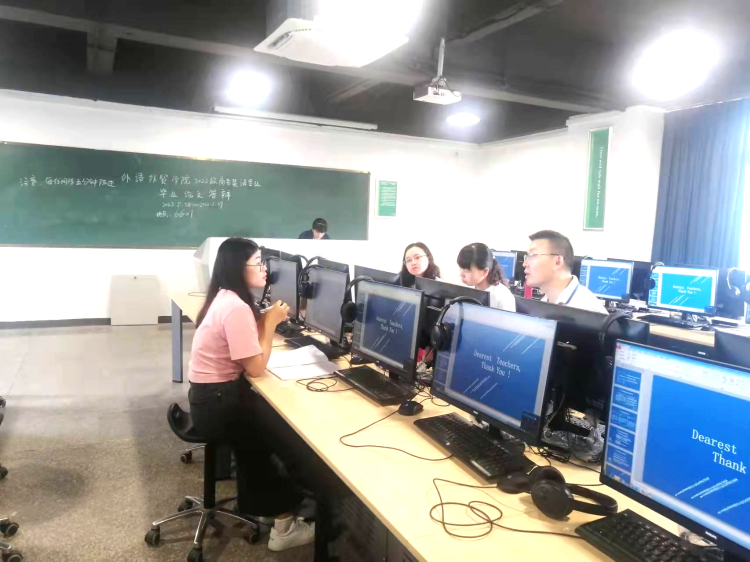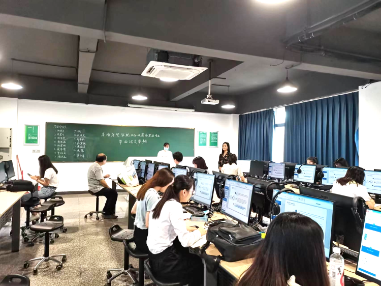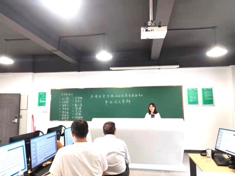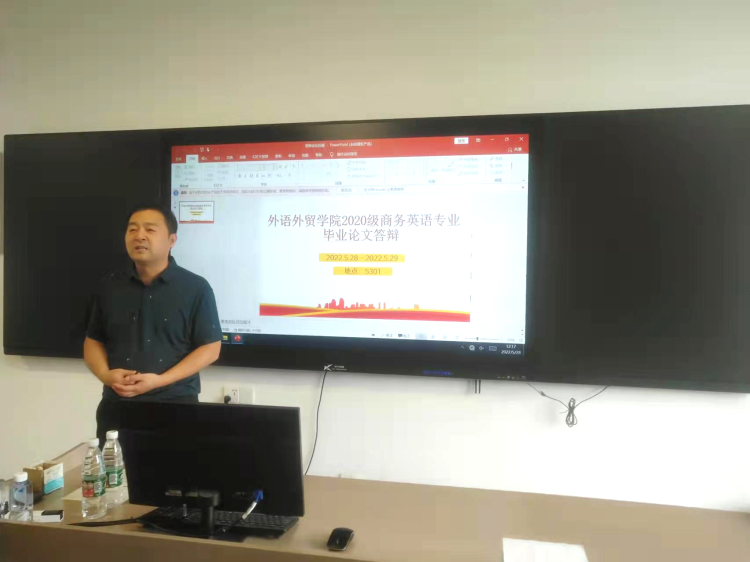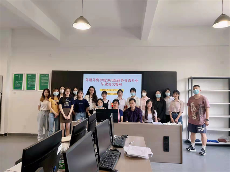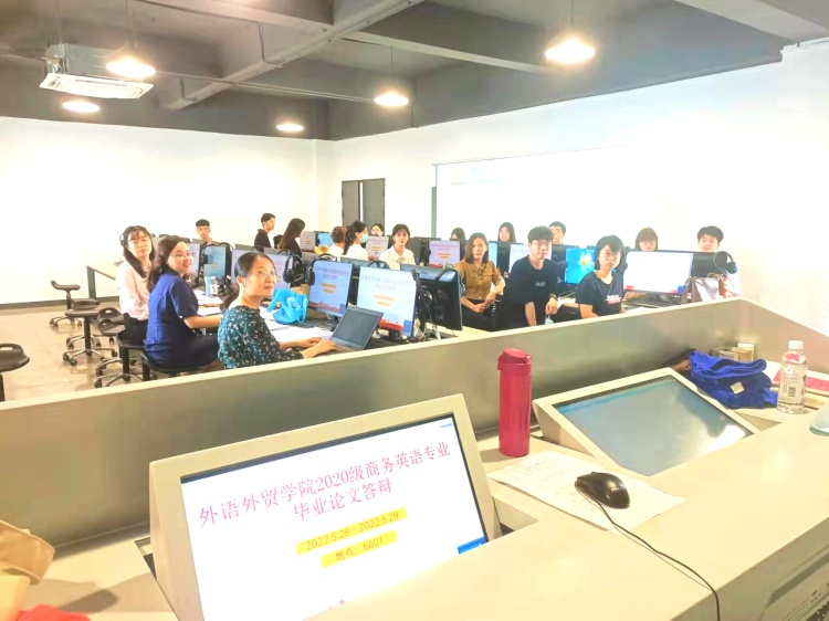 2022年5月28日-5月29日,外语外贸学院于教学楼5栋与6栋部分教室举办2022届商务英语专业毕业论文第一次答辩会。本次会议邀请了澳门大学英语语言学博士、硕士生导师、暨南大学外国语学院英语系主任朱红强副教授,中山大学语言学博士、广东金融学院陈树坤副教授,广东外语外贸大学博士、中山大学南方学院黄新辉副教授,华中科技大学博士、广东技术师范学院蒋友梅副教授,仲恺农业工程学院外国语学院郑定明副教授,广东轻工职业技术学院应用外语学院黄友嫦副教授等校外专家担任答辩会嘉宾,我学院李磊院长、杜艳红副院长、廖丽玲副院长、专业主任张茂林老师、全体论文指导教师及大部分应届毕业生参加了此次线下毕业论文答辩会。