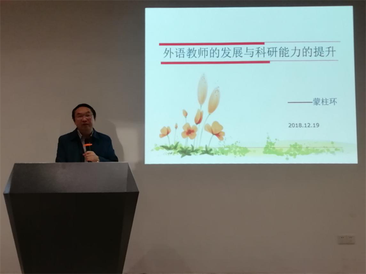 2018年12月19日,广东食品药品职业学院蒙柱环教授应邀来我院作题为“外语教师的发展与科研能力的提升”的讲座。报告在新图书馆一楼发布厅举行,由院长方玲玲教授主持,外语外贸学院全体教师参加了此次讲座。