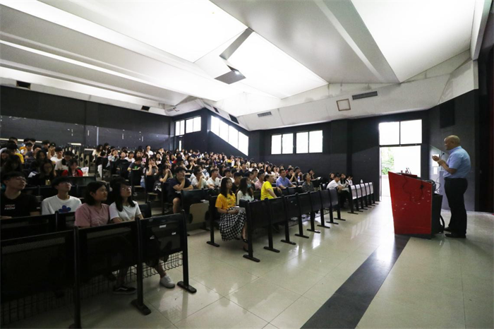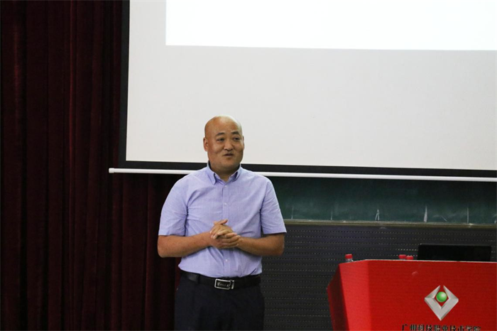 2019 年 5 月 22 日,广州科技职业技术学院客座教授,广州南沙航运物流行业协会会长、广州鹏程国际货运代理公司总经理刘鹏先生应外语外贸学院邀请,到访广州科技职业技术学院,为外语外贸学院商务英语专业、报关与国际物流专业、商务日语专业 2017 级学生举办了题目为《“一带一路”国际物流发展新趋势》的学术讲座。外语外贸学院院长方玲玲教授、党总支副书记刘良、学院就业处副处长邱健、报关与国际货运教研室主任吴祖建等参加了讲座。