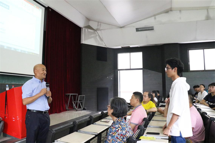 刘鹏会长在讲座上与外语外贸学院学生回答问题环节上互动