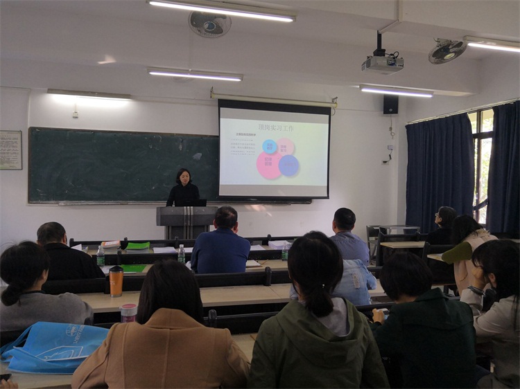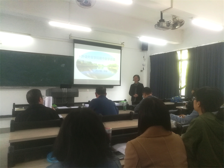 11 月22日,外语外贸学院全体教职工在1204教室接受学校对本学院进行的期中教学检查。学校教务处曹晓光处长和督导办刘传贤教授、就业办邱健副处长、实训中心相关老师都参加了此次检查会议。会议由方玲玲院长主持。尹姣副院长就学院的教学管理与检查、顶岗实习工作、上学期及格率最低的科目及改进方案等问题向学校领导和学院各老师做了汇报。汇报后学校各领导还与老师们就我院的科研、教学、实训等问题进行了交流,并对我院的各项工作给予肯定并提出了宝贵的建议。