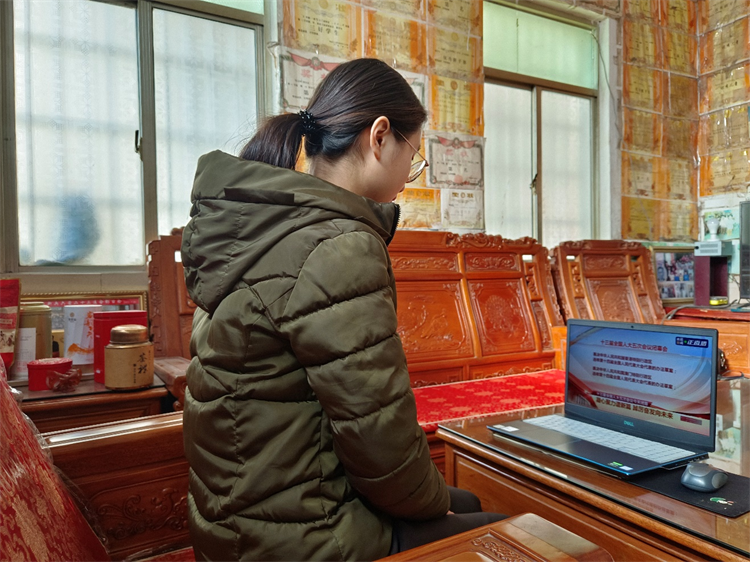 (学生党员代表陈宇晴在满墙都是奖状的家中观看会议直播)