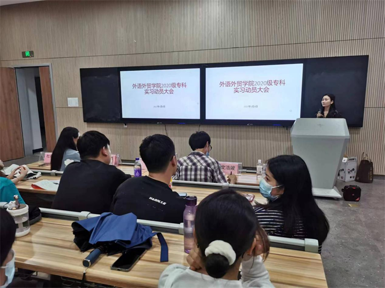 为做好2020级专科学生的实习准备工作,帮助学生树立正确的实习心态,顺利渡过从校园到职场的心理调适期,6月8日,我院成功举办2020级专科学生实习动员大会暨“阿里巴巴数字贸易精英班”项目宣讲会。外语外贸学院院长李磊、副院长杜艳红、党总支副书记刘良、教研室副主任文浩竣、付辉红以及2020级专科所有学生出席了此次会议。广州新思路教育科技有限公司总监杜晓麟、江倩雯参加了此次活动。