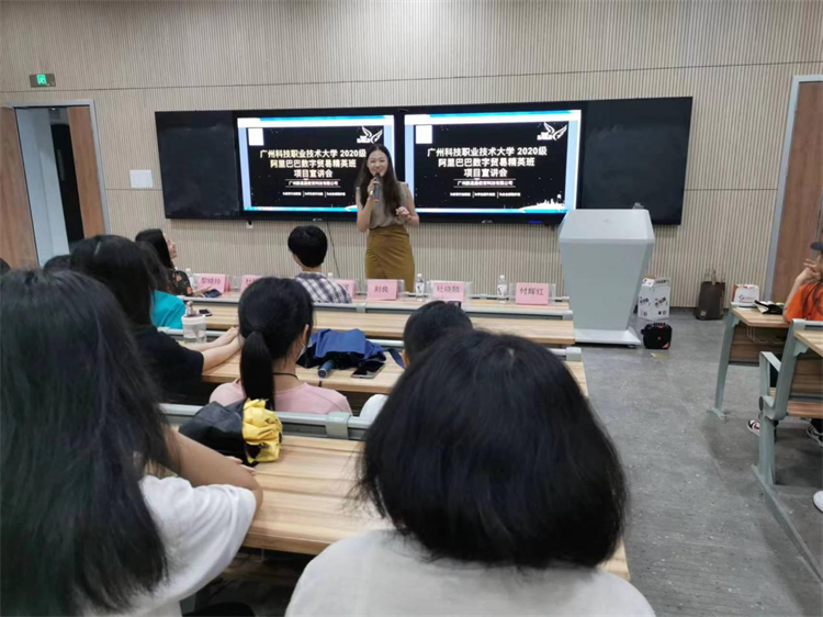 动员大会后,来自广州新思路教育科技有限公司的企业嘉宾杜总和江总上台发言,拉开了2022年华亿在线“阿里巴巴数字贸易精英班”的序幕。杜总围绕外贸发展历史、跨境电商发展趋势、当前市场机遇等话题与同学们热烈互动。她表示,跨境电商作为新兴行业,目前还存在较大的人才缺口,阿里巴巴百万人才计划为同学们提供了难得的职业发展机会,真诚欢迎专业能力优秀、外语水平扎实,对跨境贸易感兴趣的同学们报名参加本次精英班培训。会后,同学们积极报名,与企业嘉宾交流互动,现场气氛非常热烈。