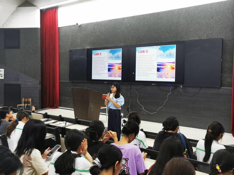 接着,李磊院长详细分析了四首毛泽东诗词《沁园春·长沙》《菩萨蛮黄鹤楼》《忆秦娥·娄山关》《七律·长征》的翻译 ,并分别对这些诗词的翻译做了评价,指出这些诗歌和翻译大都结合了自然美与中国革命之美。在谈到诗歌的翻译时,李院长还提及到了许渊冲先生的“三美论”--意美、音美、形美。李磊院长评价毛泽东诗词是中国文化的宝贵财富。学习毛泽东诗词,并从中获取营养,正是我们党增强“两个确立”,“四个意识”、坚持“四个自信”和做到“两个维护”的基本要求,是开展主题教育,牢记初心使命的具体行动,并寄语外语外贸学院学生要认识时代发展趋势,养成独立思考能力以及对错误思潮的鉴别能力。