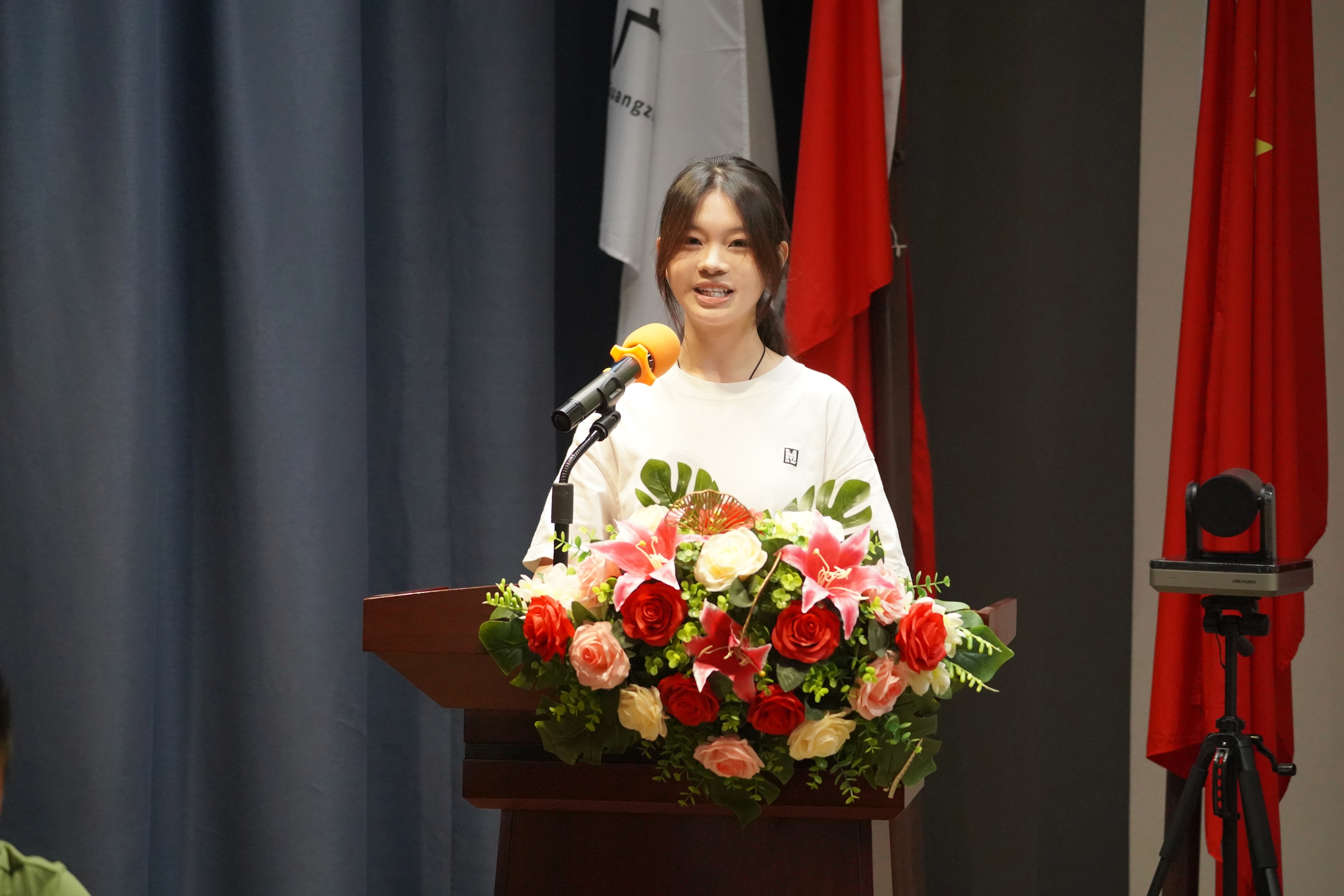 在校生代表李茵榆为即将踏上军旅生涯的新兵们送上最崇高的敬意和最诚挚的祝福。她表示这些同学们不甘于平凡,为国家安全和建设贡献自己力量,这份对家国的热爱情怀,这份为国防事业的奉献精神,是我们全体广科大学子学习的榜样。希望同学们到部队后能够牢记使命,不忘初心,刻苦训练,为实现强国梦、强军梦贡献自己的力量。