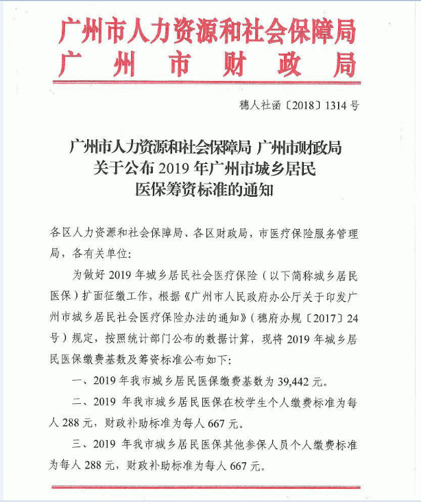 关于公布2019年广州市城乡居民医保筹资标准的通知