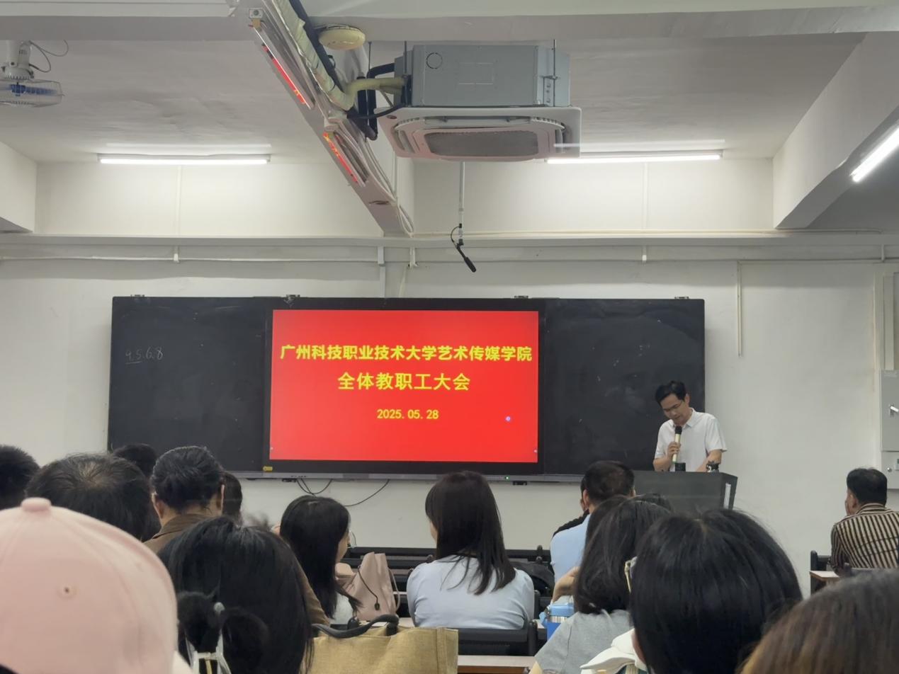 2025年5月28日下午1:30,艺术传媒学院在2407教室召开全体教职工会议。艺术传媒学院陈华院长、于玥党总支书记、肖宇霖副院长、范琳琳党总支副书记以及学院全体教职参加会议。会议聚焦教学质量提升、规范管理与未来发展规划,...
