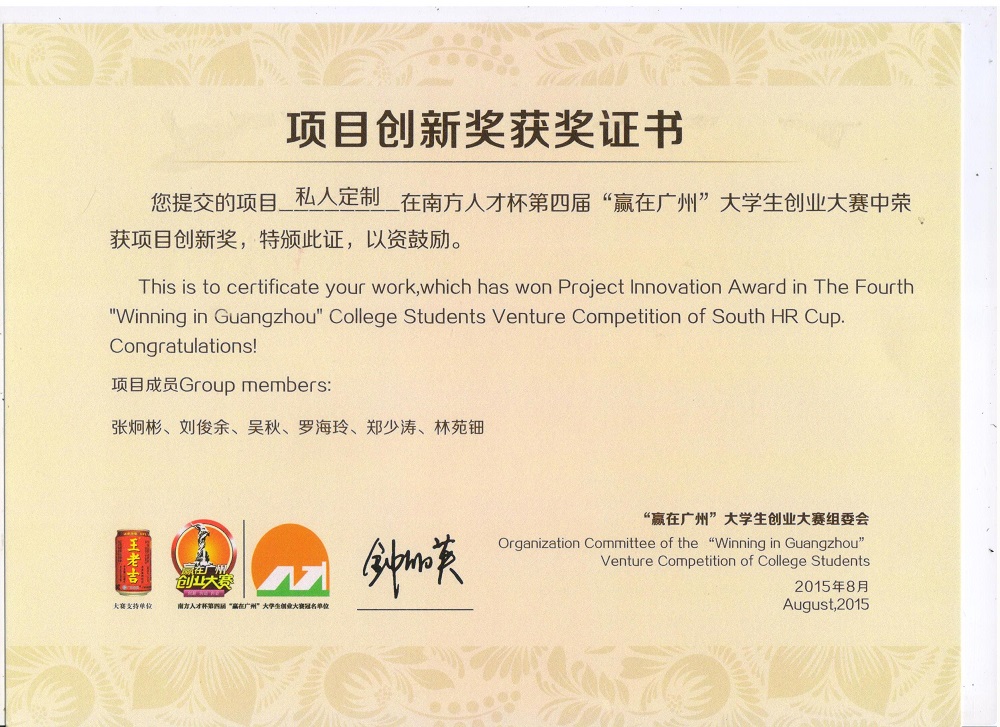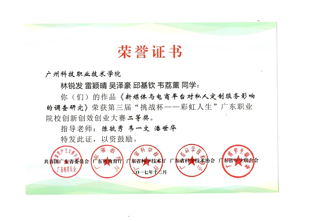 (6)项目组成员韦一利同学负责的项目《新媒体与电商平台对私人定制服务的影响》获得2016年度广东省大学生专项资金培育项目立项,并在2016年11月通过结题。代表学校参加第三届“挑战杯—彩虹人生”广东职业院校创新创效创业大赛并获得二等奖奖。