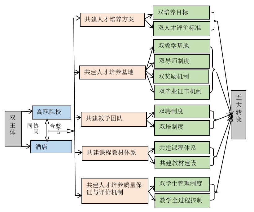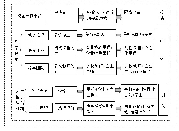 根据高职院校教学安排规律和人才成长理论,经过与多家酒店企业的交流、探讨,按照每一届学生全学程 6 个学期的时间跨度,制度以下双主体酒店中高端服务(管理)人才培养模式的实施步骤: